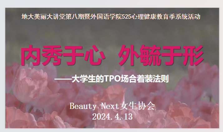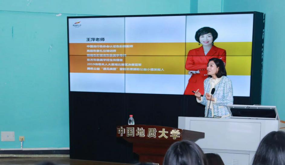 作为外国语学院红外·线大思政课堂审美素养提升的重要载体和“525”心理健康教育季系列活动,由中国地质大学(武汉)bevictor伟德官网主办、Beauty Next女生协会承办的美丽大讲堂第八期“内秀于心 外毓于形”于4月12日下午15:00,在北一楼报告厅正式开讲。本次活动特邀资深专家——美丽大讲堂第八期特邀嘉宾王萍老师讲授大学生TPO场合着装法则,Beauty Next女生协会及bevictor伟德官网的诸位同学参加本次讲座。