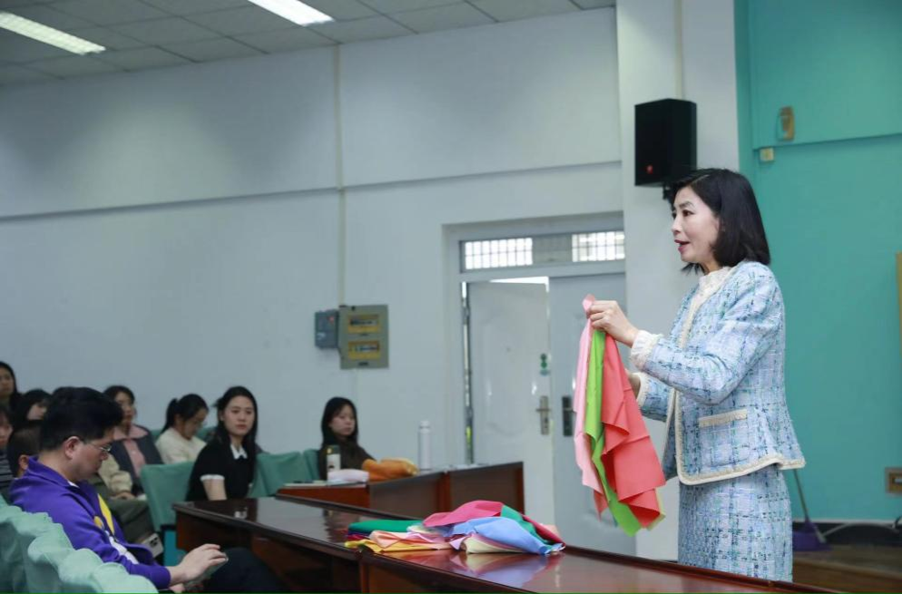 在展示冷暖色系时,老师不仅拿色布为大家详细讲解属于不同季节的色彩搭配,还邀请了多位身着不同色系的同学上台展示,使得同学们更加直观详细地了解了冷暖色的区别以及在日常生活中搭配的技巧。
