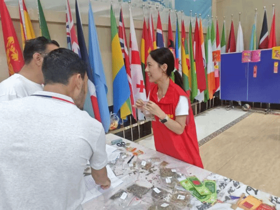 相邻的香囊体验区,则弥漫着另一种宁静而芬芳的气息。香料样品展示瓶内,桂花、艾草、丁香等散发出天然草药香。志愿者引导留学生们通过"闻香识药"互动,了解桂花安神、艾草驱寒等药用价值。在文化讲解环节,特别强调了香囊作为非物质文化遗产的传承意义。