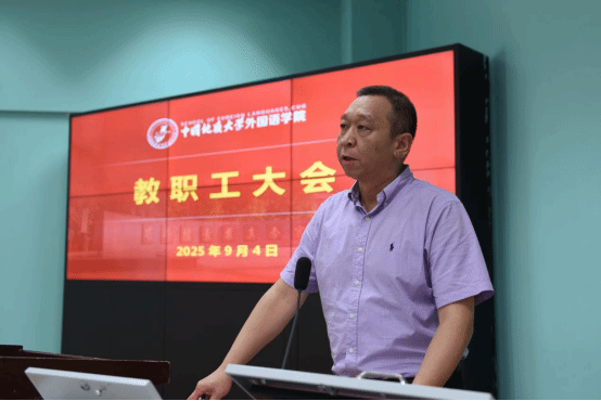 院长张峻峰传达了学校年中工作会议精神,并结合学院实际,对新学期重点工作进行部署。他强调,面对当前学科建设、人才培养等方面的挑战,全院教师应进一步增强危机意识和责任意识,主动对接学校发展战略,突出外语学科在学校的定位与特色。他特别指出,要加快推动AI技术与外语教学深度融合,优化课程体系,提升人才培养质量。同时,要积极拓展社会合作与对外开放办学,争取更多资源支持学院发展。